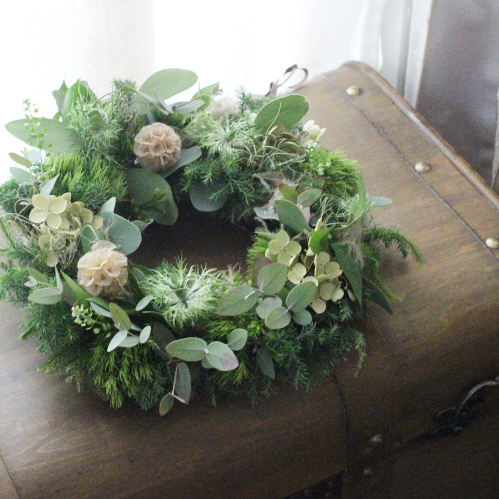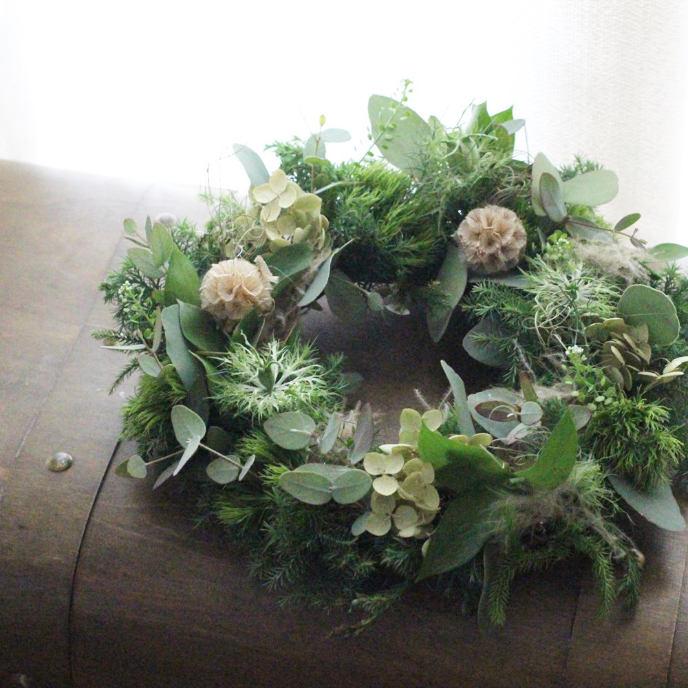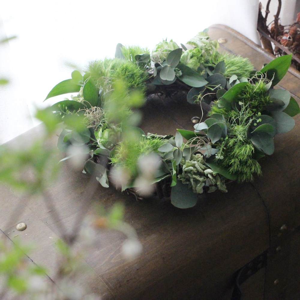 数種類のグリーンやお花と合わせて、ふんわりグリーンリースを作ります。