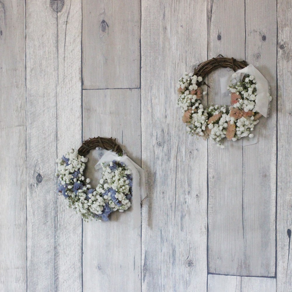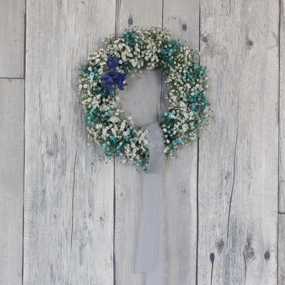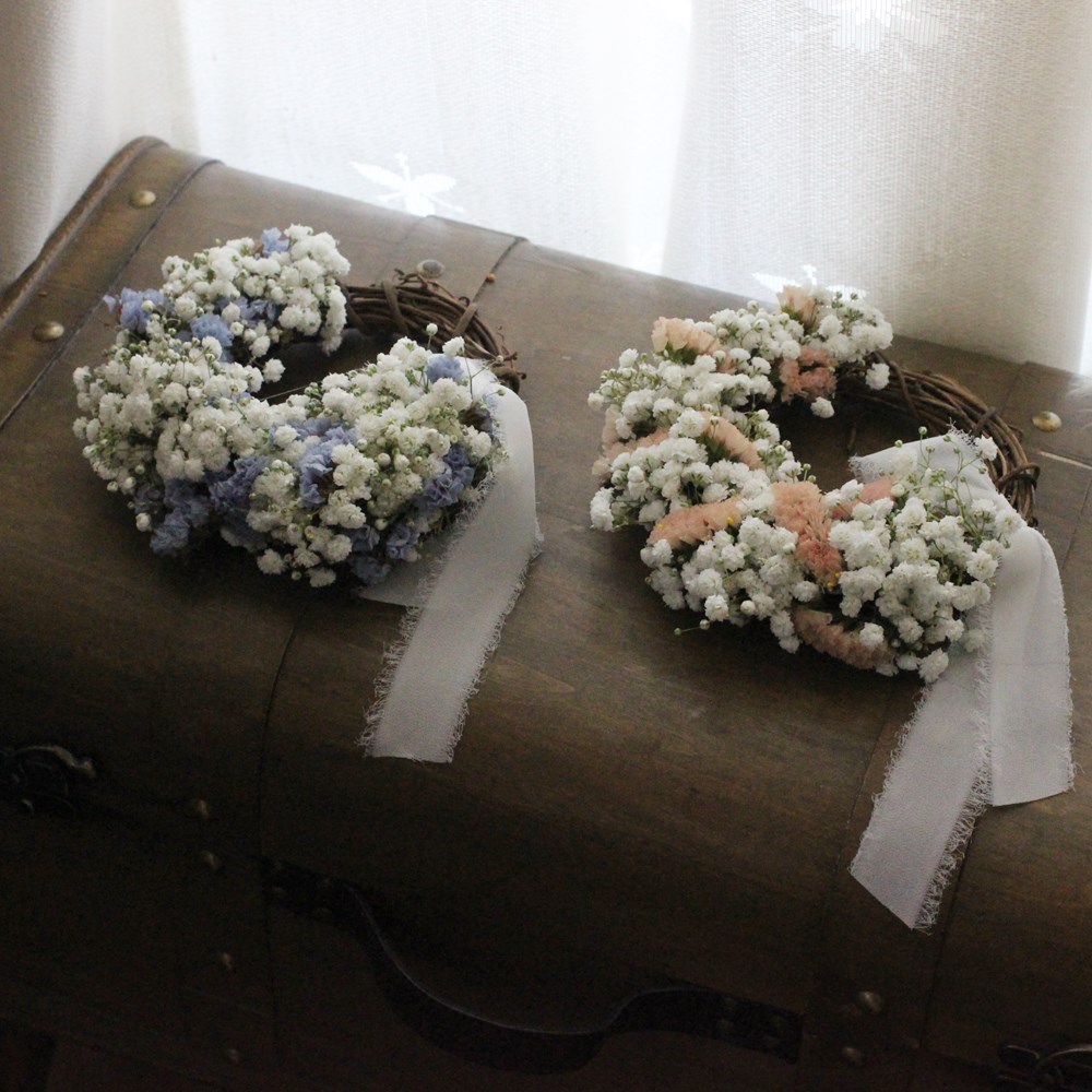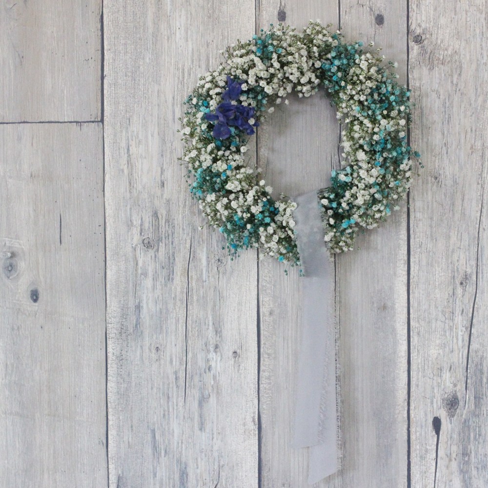 ホワイトのかすみそうを、スターチスやブルーのかすみそうなどと混ぜて作るリース。