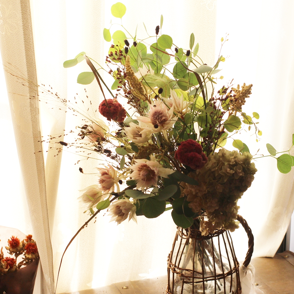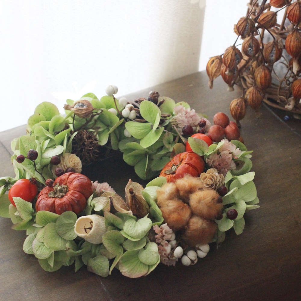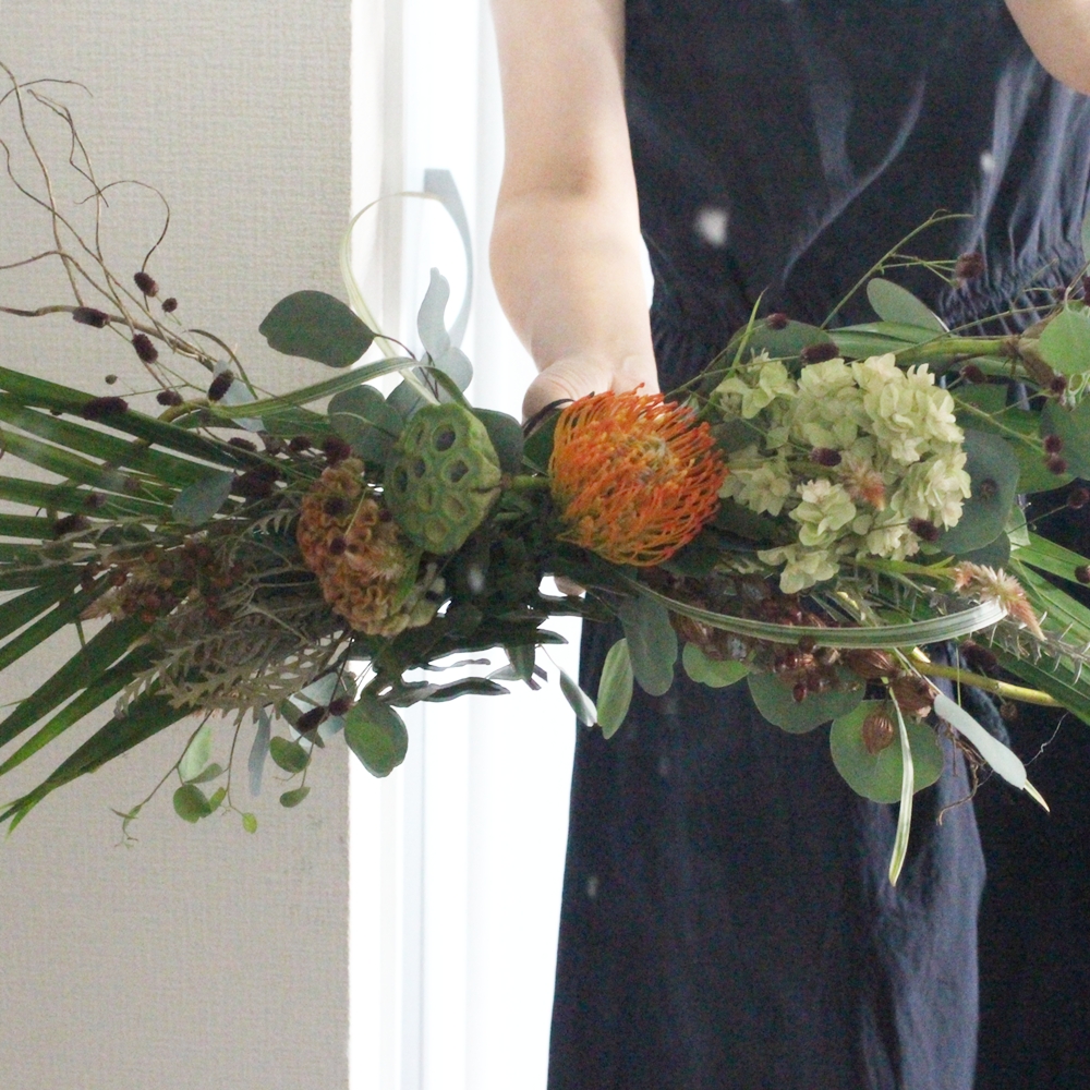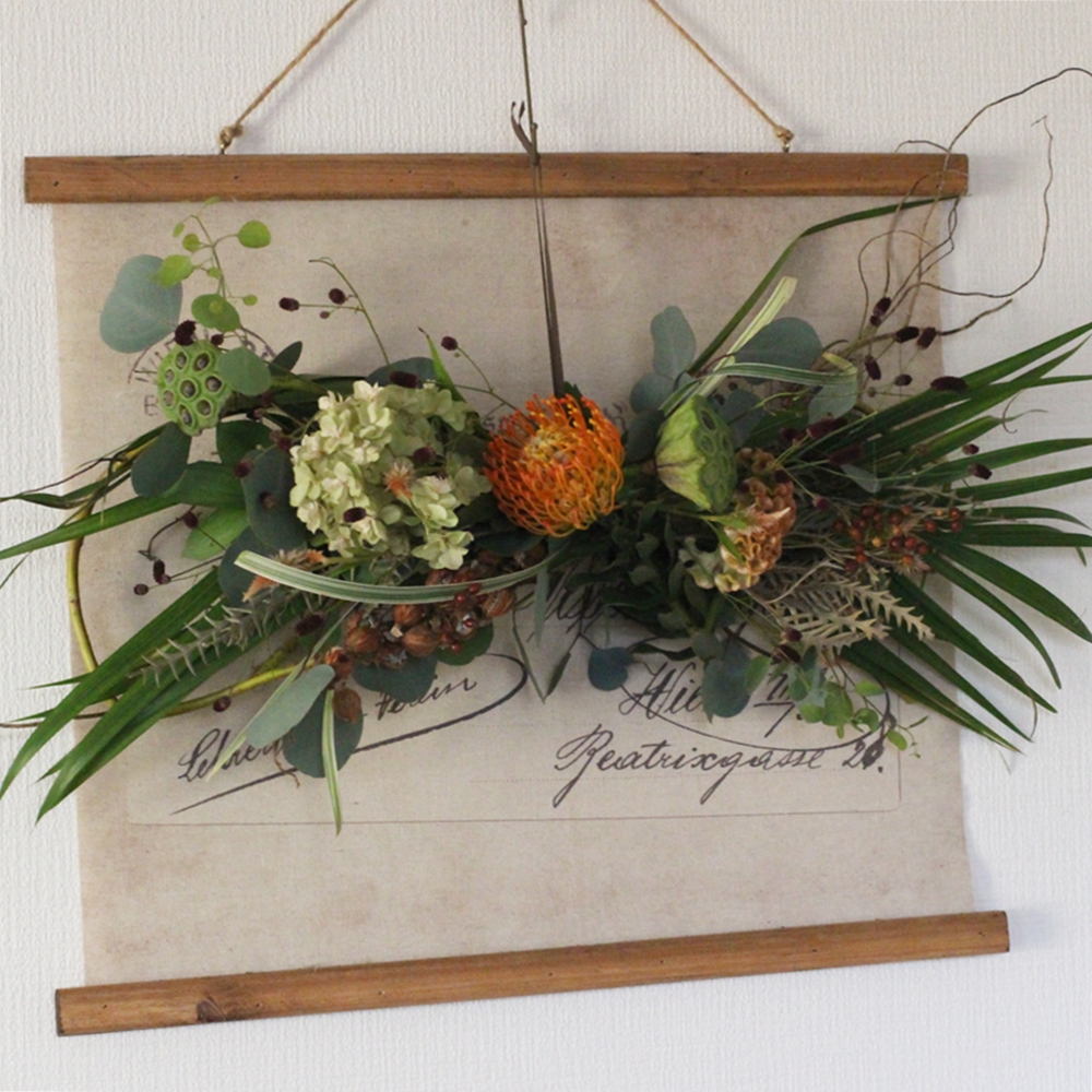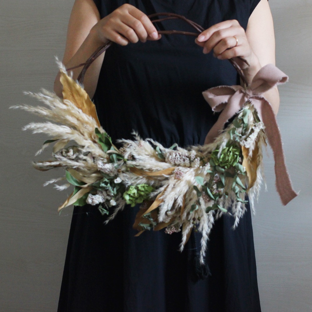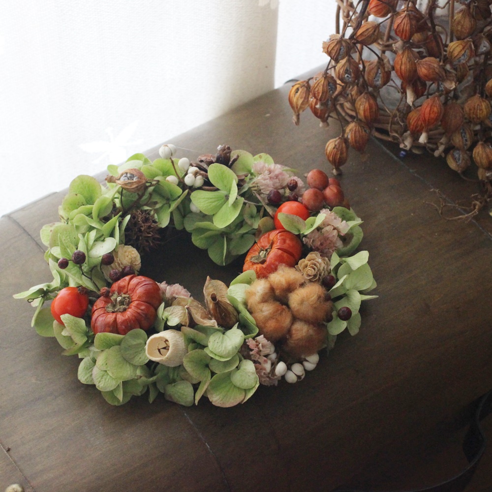 ドライになるフレッシュフラワーや秋のドライフラワーで制作していただきます。