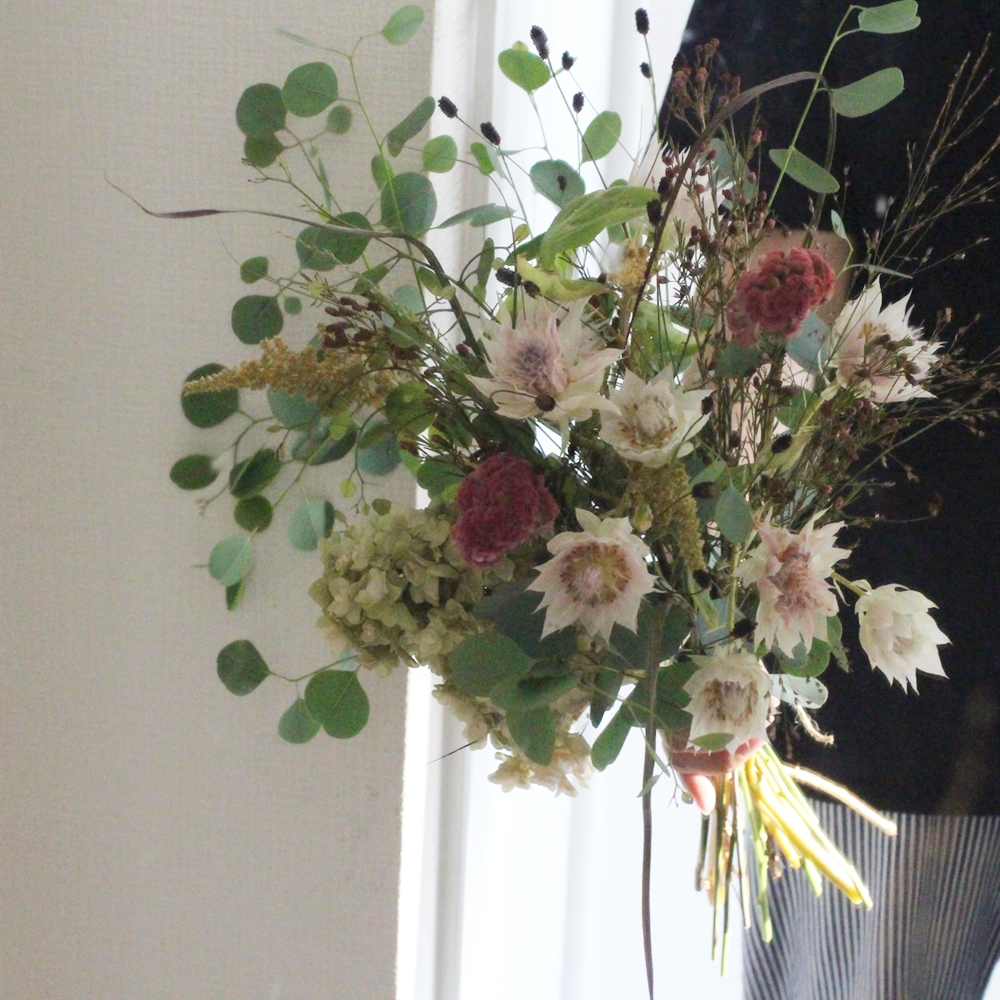 グリーンをたっぷり使い、秋色のドライフラワーやフレッシュフラワーのお花たちを使ったブーケです。
