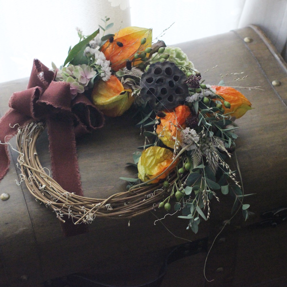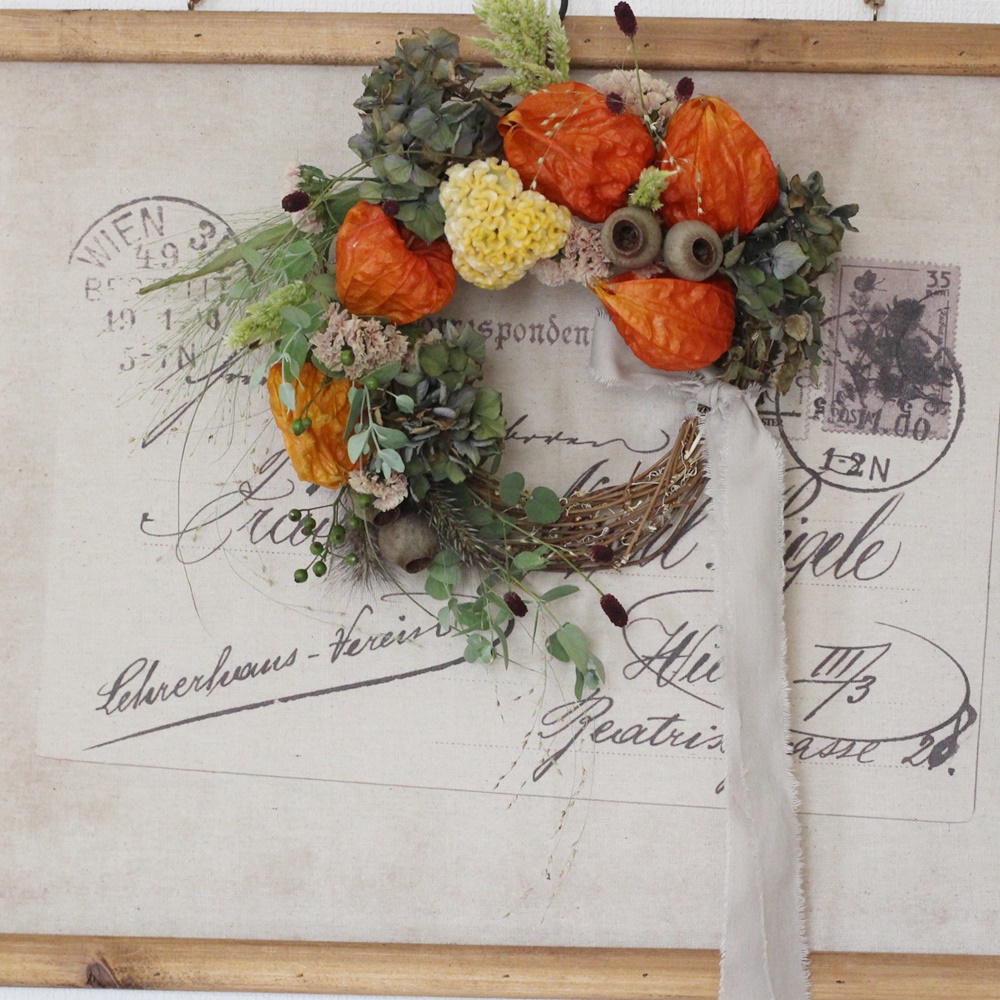 ふっくらした形のかわいい鬼灯(ホオズキ)をメインに、秋のお花やグリーンで飾るオレンジリース♪