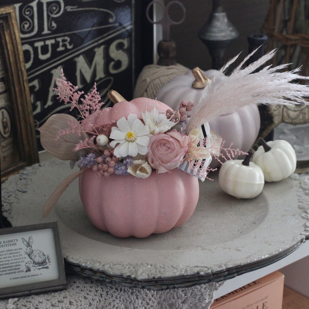 カボチャの器に、プリザーブドのジニアとローズ、木の実やピンクのススキを入れたアレンジです。