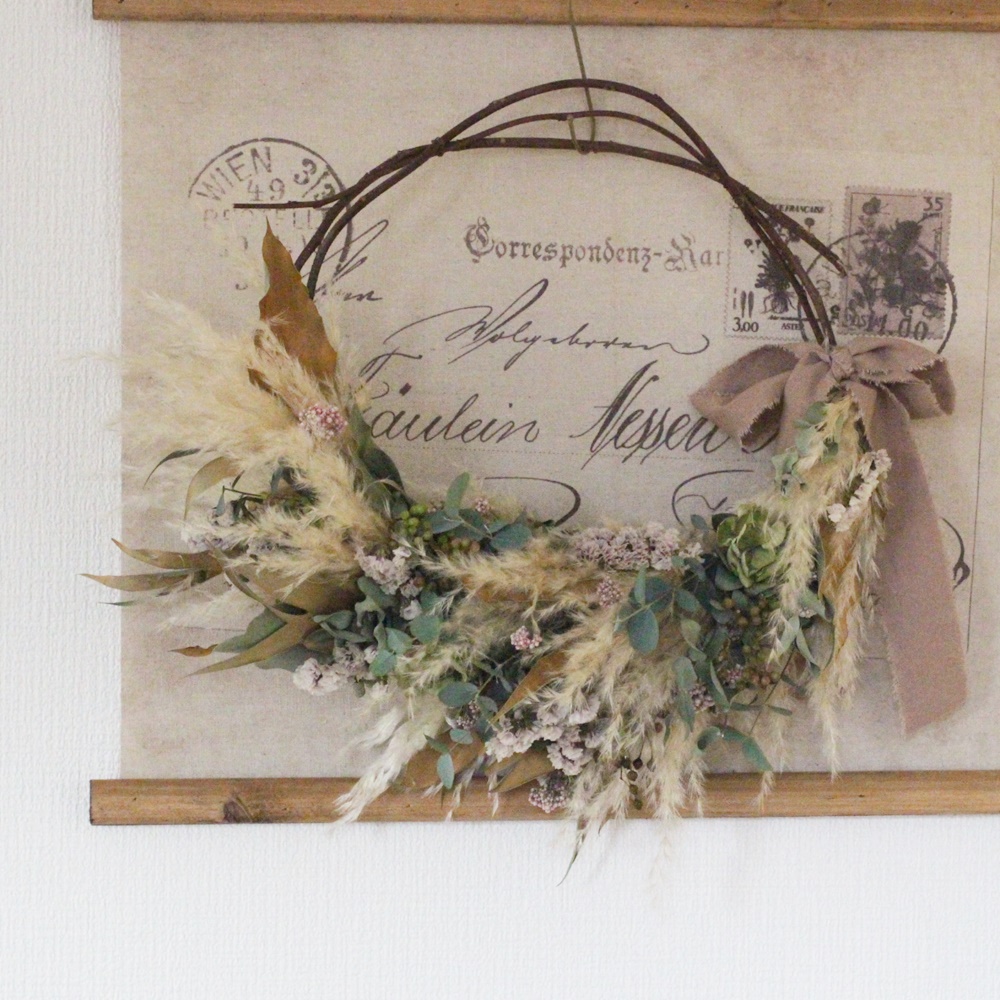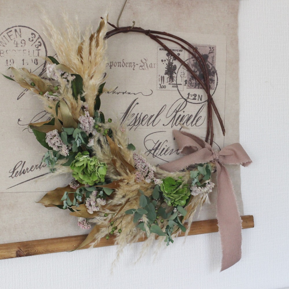 パンパスグラスをメインに、グレビレア、ユーカリや野バラの実、アジサイ、スターチスなどで制作していただきます。