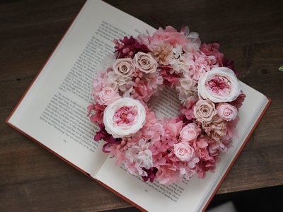 ピンクのリースは可愛らしくなりがちですが、落ち着いた雰囲気にまとめました。