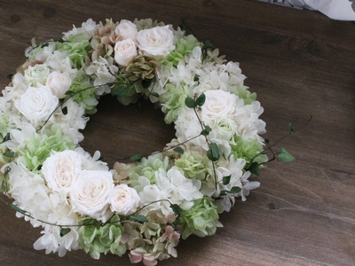 アーティフィシャルフラワーは枯れることがありませんので、外玄関のリースや一年中飾るアレンジメントなどにとてもおすすめのお花です。